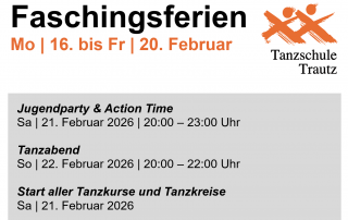 🎭✨ Faschingspause in der Tanzschule Trautz ✨🎭   Während der Faschingsferien gönnen wir uns eine kleine närrische Auszeit: 📅 16.–20. Februar 2026 bleiben Tanzschule & Büro geschlossen.   🔥 21.02. (20–23 Uhr) – Action Time & Jugendparty 🌟 22.02. (20–22 Uhr) – Tanzabend   💃🕺 Start aller Tanzkurse & Tanzkreise: Sa, 21.02.