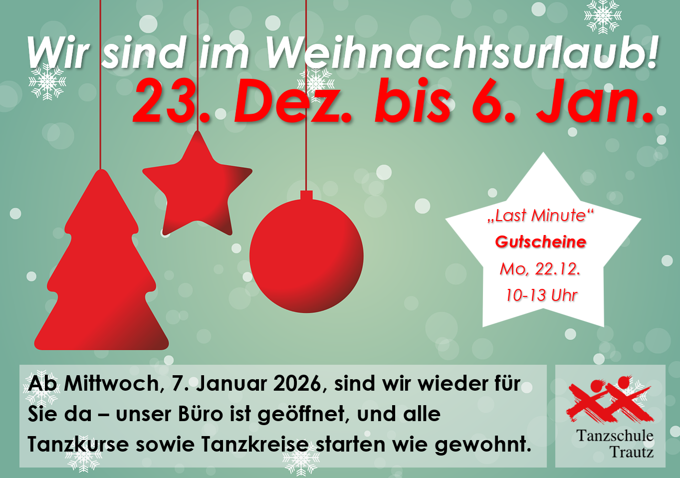 Thomas Acker2026-01-15T16:32:53+02:00Tanzpartner gesucht? Geht es Ihnen auch so….? Sie würden gerne tanzen, Ihnen fehlt aber der Tanzpartner / die Tanzpartnerin? Hier hilft die Tanzschule Trautz in Olching. Dort gibt es jetzt ganz neu: Das Tanz-Speed-Dating. Tanzbegeisterte und Tanzinteressierte, welche keine(n) Tanzpartner(in) haben, können in kurzer Zeitabfolge Gleichgesinnte persönlich kennenlernen und so den passenden Tanzpartner oder die [...]