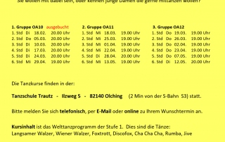 Bitte melden Sie sich telefonisch, per E-Mail oder online zu Ihrem Wunschtermin an. Kursinhalt ist das Welttanzprogramm der Stufe 1. Dies sind die Tänze: Langsamer Walzer, Wiener Walzer, Foxtrott, Discofox, Cha Cha Cha, Rumba, Jive Die Tanzkurse dauern 6 x 1 ½ Stunden und kosten 70,- € pro Person. Für Wiederholerinnen (bitte mit Nachweis aus [...]