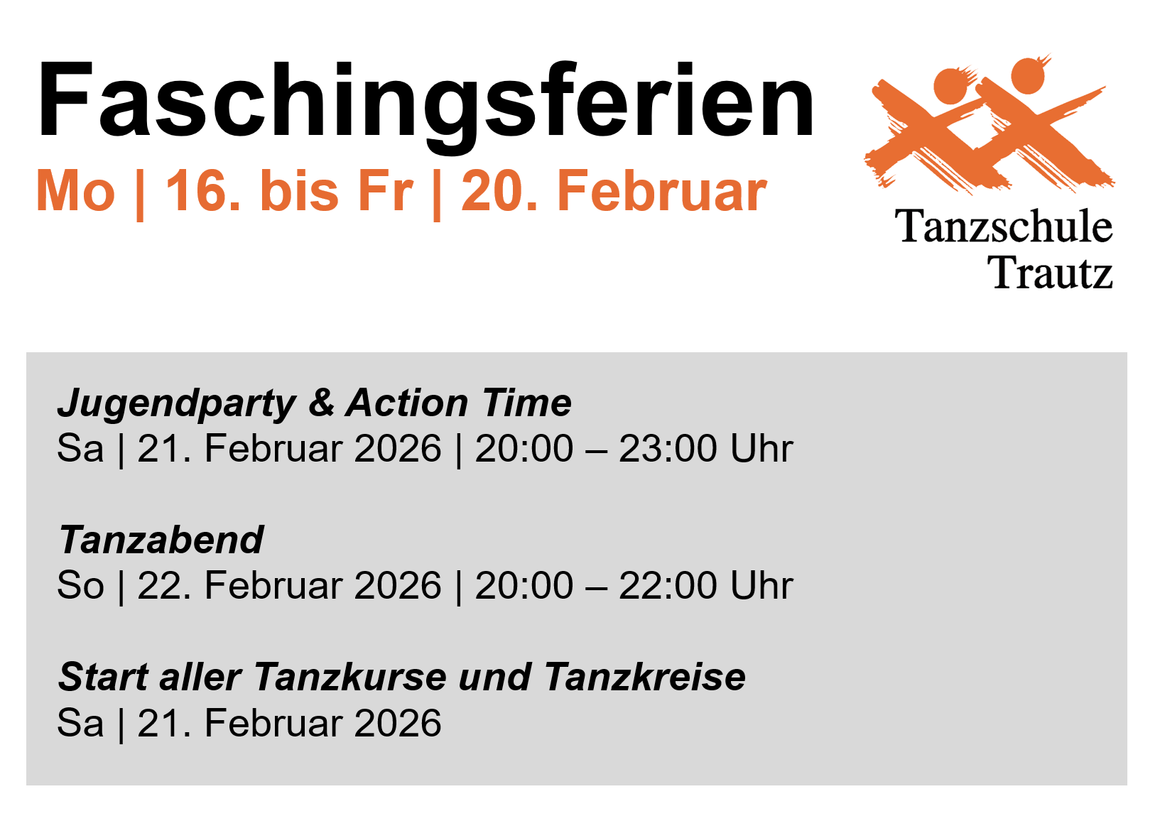 Thomas Acker2026-02-13T12:22:51+02:00🎭✨ Faschingspause in der Tanzschule Trautz ✨🎭 Während der Faschingsferien gönnen wir uns eine kleine närrische Auszeit: 📅 16.–20. Februar 2026 bleiben Tanzschule & Büro geschlossen. 🔥 21.02. (20–23 Uhr) – Action Time & Jugendparty 🌟 22.02. (20–22 Uhr) – Tanzabend 💃🕺 Start aller Tanzkurse & Tanzkreise: Sa, 21.02.